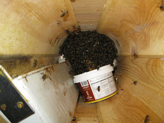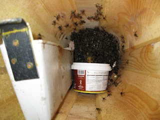 Hava güzel ve karakovan arılarının bir kısmı dışarda çalışmaktalar, nektar ve polen gelmeye devam ediyor, gelen arı musluğa konamayıp aşagı otların içine düşüyordu, kovan önüne örtü tahtası koydumki rahat inebilsin bal ve polen yüklü gelenler.