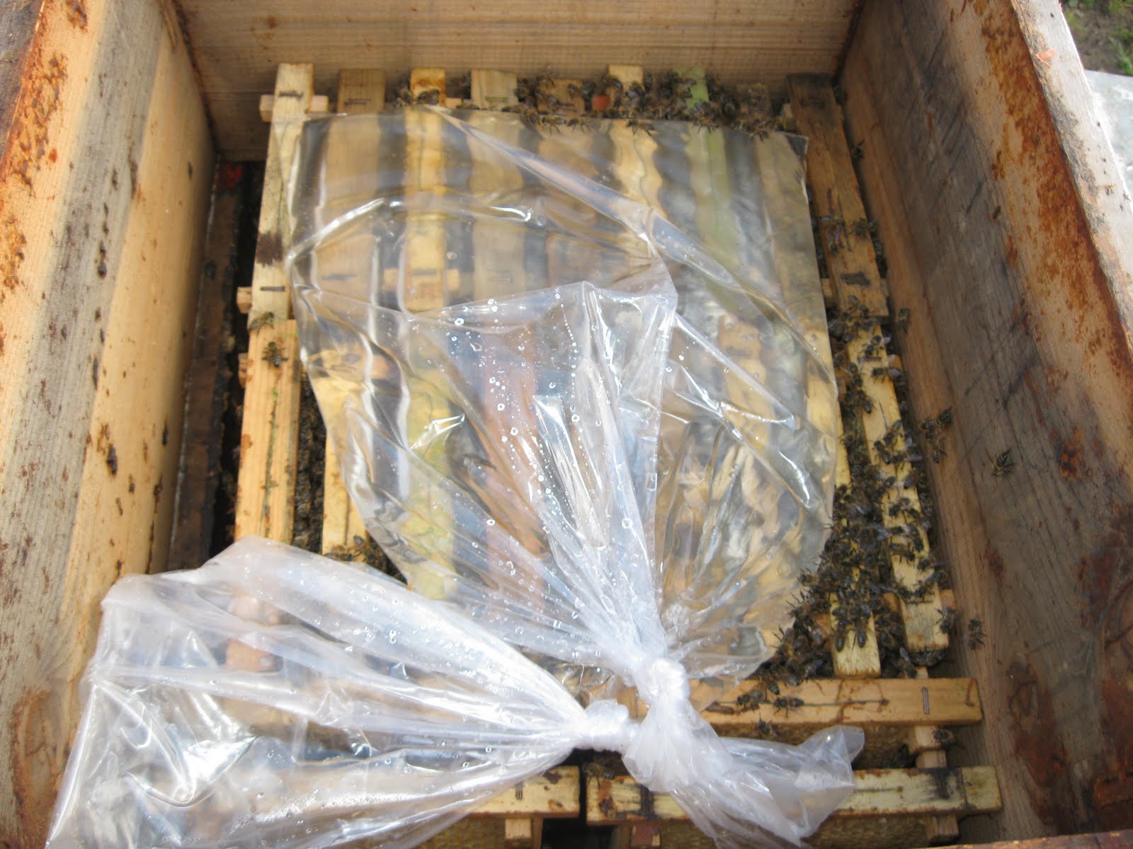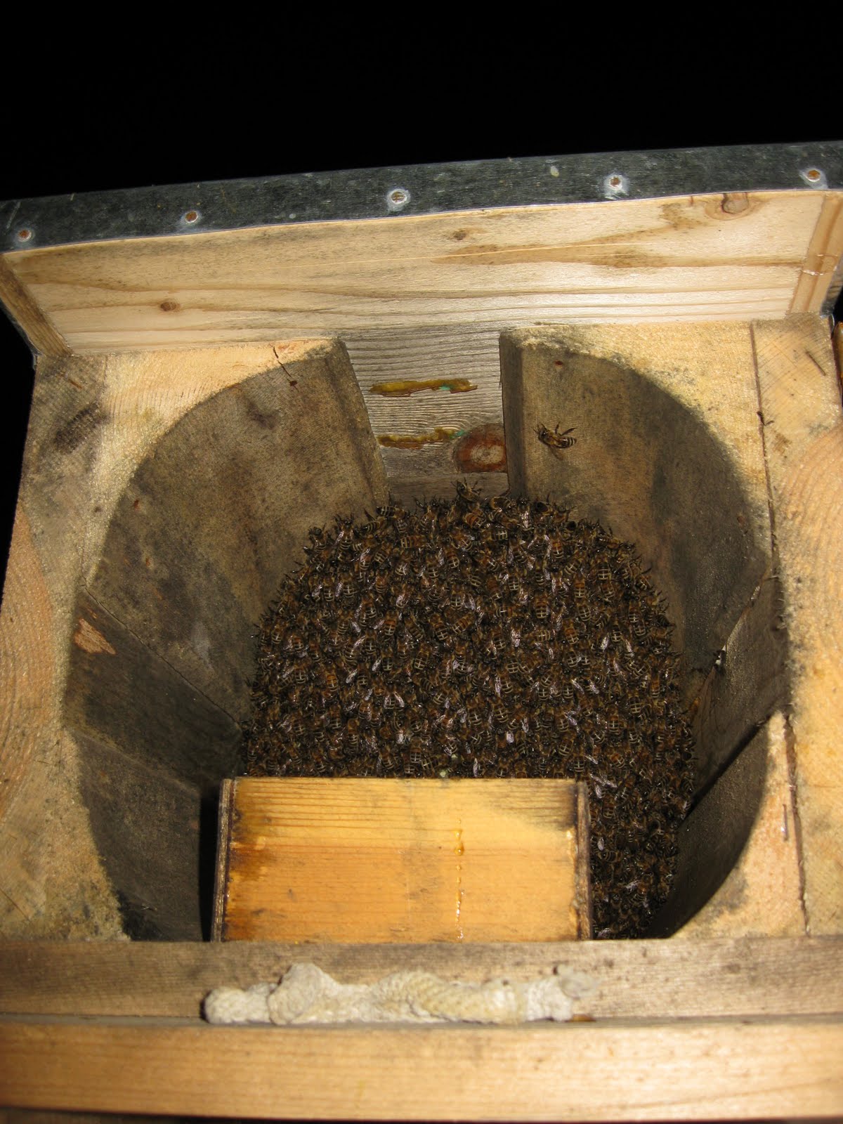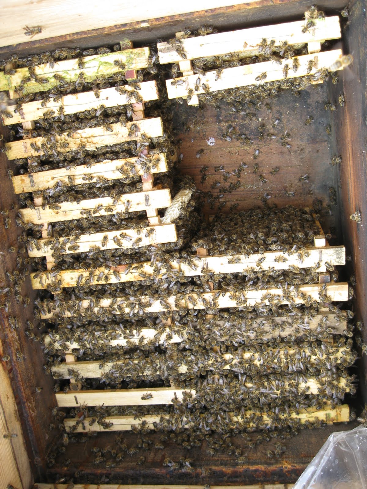 Birde rutubet aşagıda böyle birikiyor. Kovanın sağ tarafında bir eski petek var arılar onu söküyor, içine bakmadım ama aşagıya düşenlerden analadığım bu.