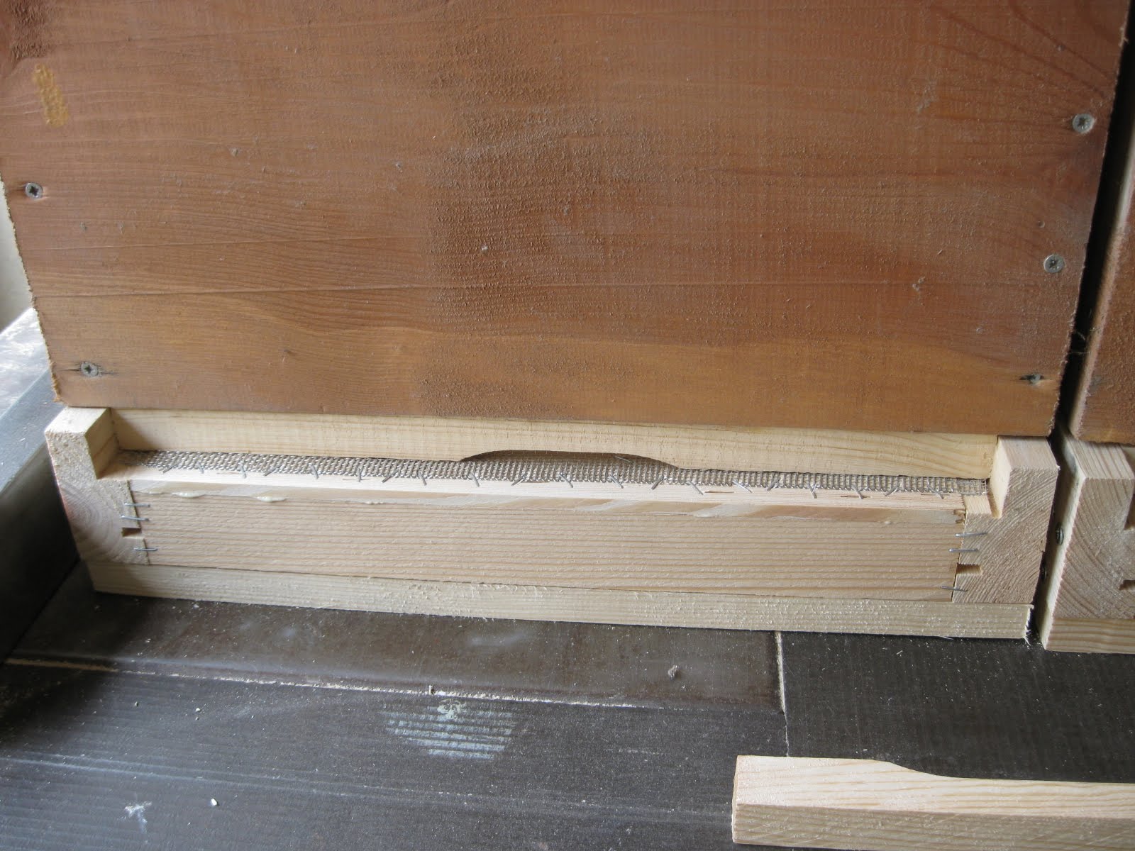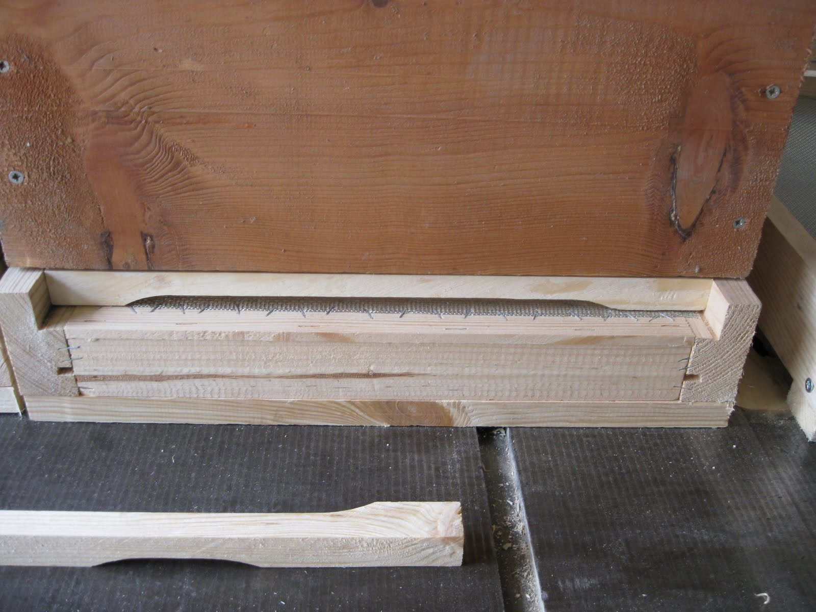 Anrti varroa dipliklerin kovanlara montajını bu şekilde yaptım. Aynı kat gibi sıkı oturuyor. Yanlardan üçer vidayla pervazları monte ettikten sonra altlarada üçer vidayla tutturuyoruz.