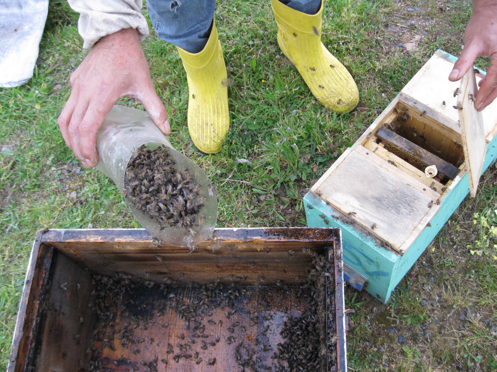 Baştan kovanı başka kovana aktarıyorum çiftleştirme kutularımızın hazır petekli çıtalarını kovana iki sıra diziyoruz. Daha sonra Muğla’dan gelen arıları bu çıtaların üstüne silkeliyorum.