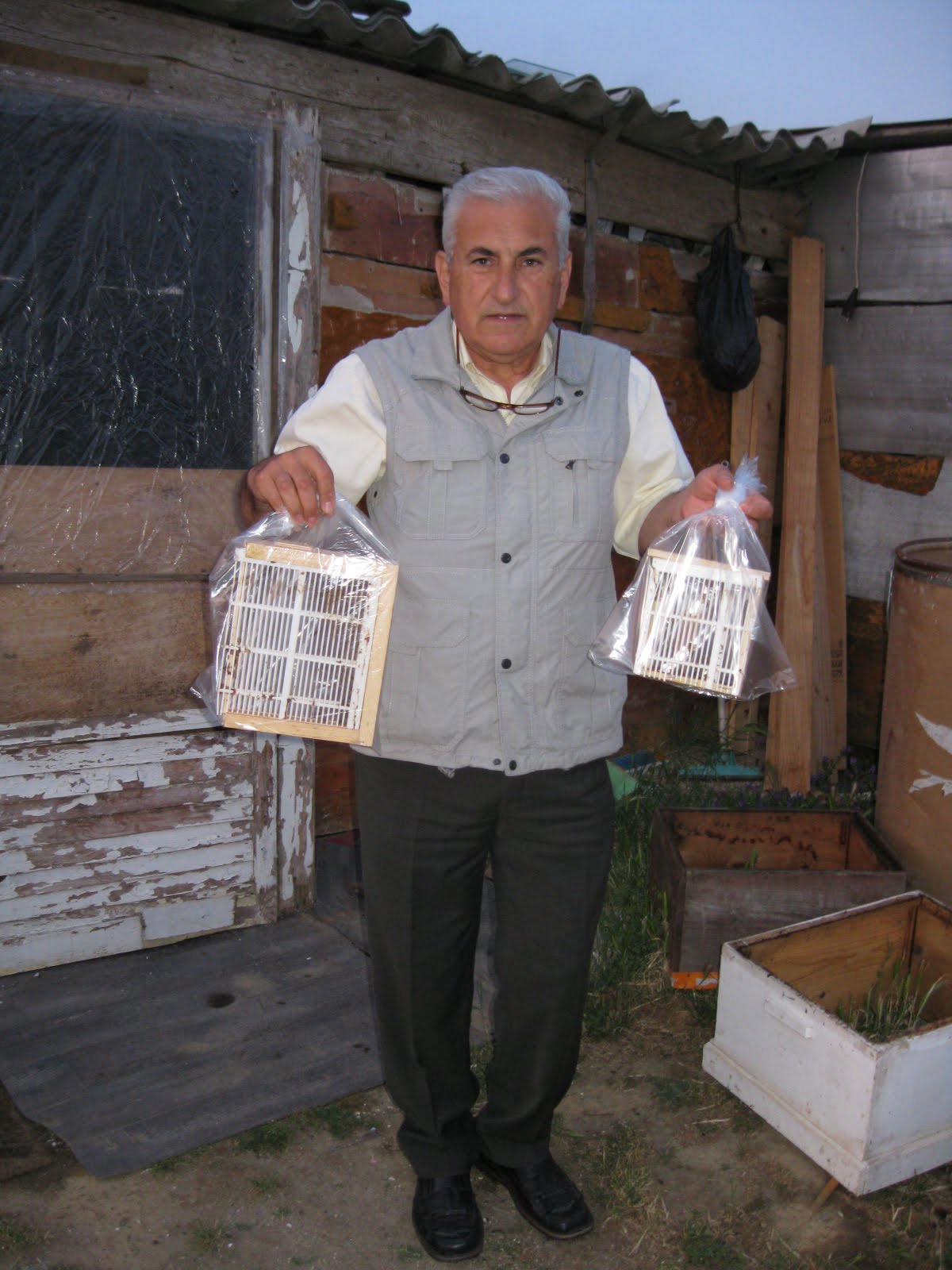 Mustafa Özgül bazı terslikler oldu 20 kovan arısı var ve tümünün analarını degiştirmek istiyordu. Geçen haftada dediki anarı kafese alıyorum iyi al dedim. Bir türlü hazır anaarı temin edemiyorum. Bu gün yarın filan derken bir haftayı yedik, analar kafeste bu hafta sonu kendiside geldi ve anaarıları tamamladık ve gitti.Bu anaarı işi öyle garip bir işki, efendim iki saat daha fazla çalışayım iş bitsin diyemiyorsunuz anaarı hazır degilse, sadece beklemek zorundasınız.