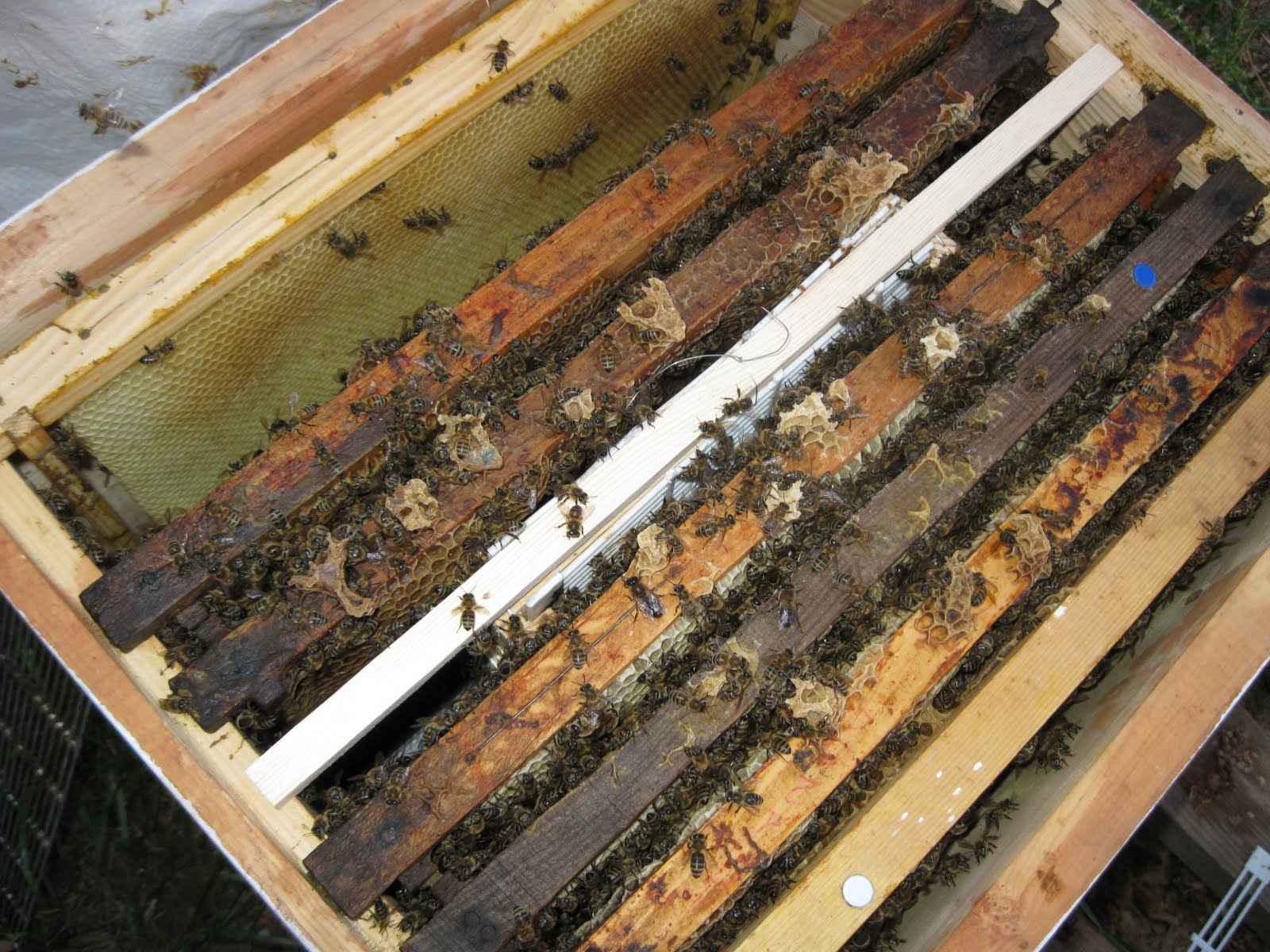 Gene kışı ormanda geçiren kovanlardan birisi, bu sıkışıp kalmış bal kemeri bayagı bir genişlemişti yer olmayınca polen ve ballan bloke oluyor daga sonrasında ise oğula gidecek. Alanını sonuna kadar açıp yeni çıtalar verdim.