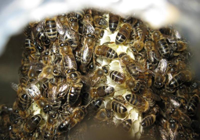 Damacana kovanın ilk görüntüleri. Arılar salkım oluşturmamış ve yavaş yavaş üst noktaya toplanmaya çalışıyorlar.